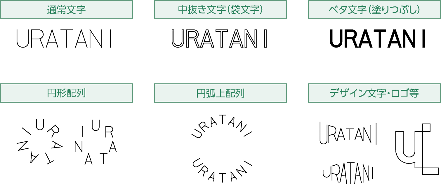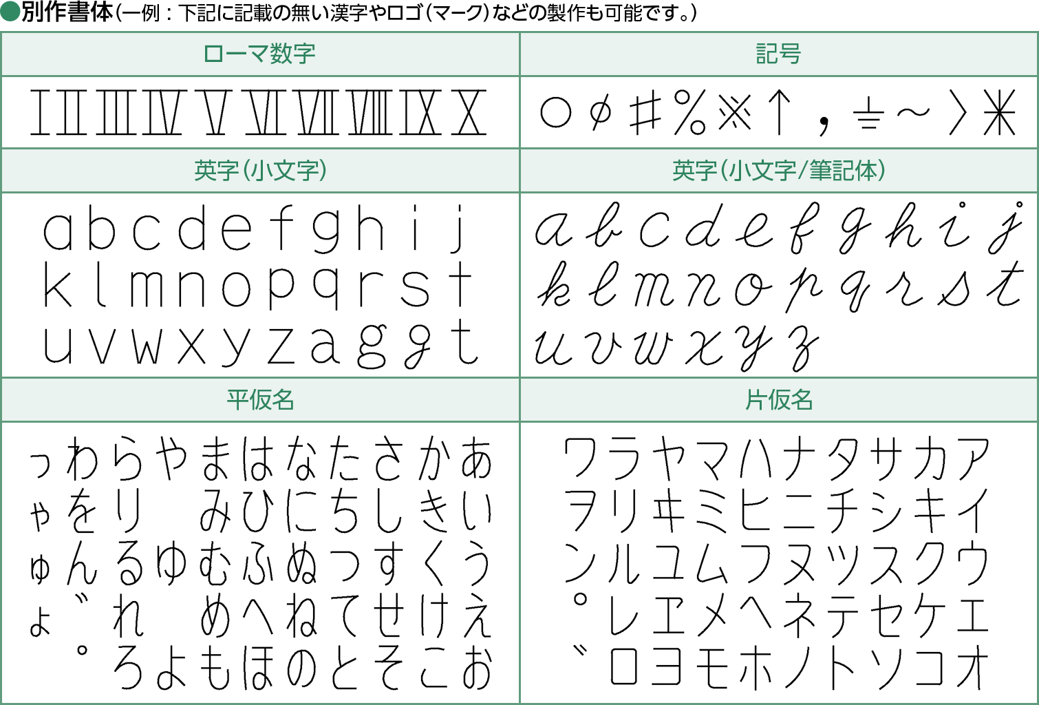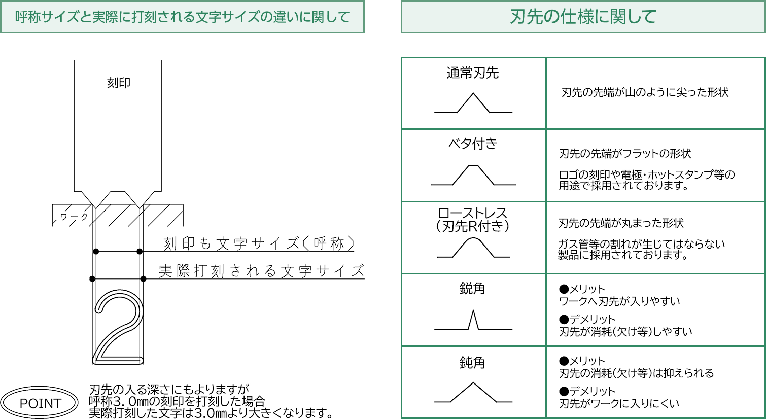 アルファベットや数字の標準書体だけではなく、様々な書体、仮名や漢字、記号、オリジナルのロゴマークやデザイン文字などあらゆる刻印の製作が可能です。刃先に関しても対象物や用途に応じて様々な仕様での対応が可能です。こちらの見本に無い仕様についてもご相談ください。