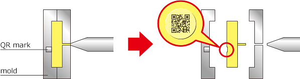 Putting QR code stickers is necessary for traceability especially in a factory. It is time consuming for factory workers. QR code insert helps marking QR code during injection process.